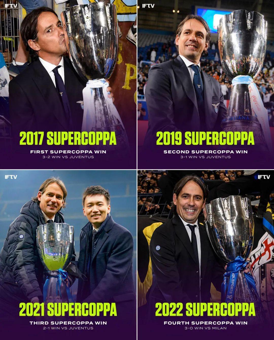 米蘭上次贏得意大利超級盃是2016年在多哈,但2018年在沙特的吉達輸給了尤文圖斯,進球的正是這次在利雅得與米蘭人住在同一家酒店的C羅。而小因扎吉則對利雅得更爲熟悉,2019年底也是在沙特首都,他帶隊的拉齊奧3比1擊敗意甲冠軍尤文圖斯奪冠,這次只是歷史重演。