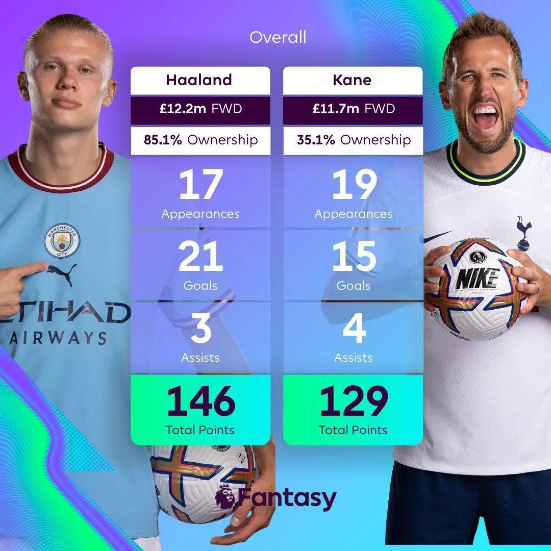 英超官方賽前也很配合,賽出兩人數據對比:哈蘭德17戰21球3助攻,34次射正場均1.24球,凱恩19戰15球1助攻,36次射正場均0.79球。效率上挪威人無疑強上一檔,印證里奧·費迪南德的評價:“你不能說一個半程不到打進21球的前鋒,會讓球隊變得更差。”