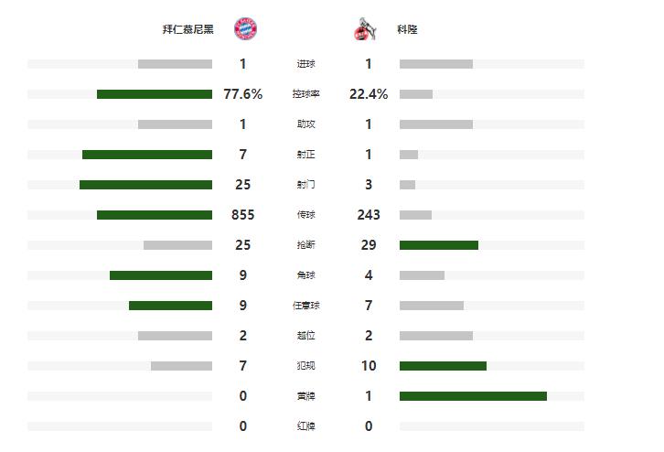 此後,雙方都無法再次改寫比分,最終拜仁1-1戰平科隆。