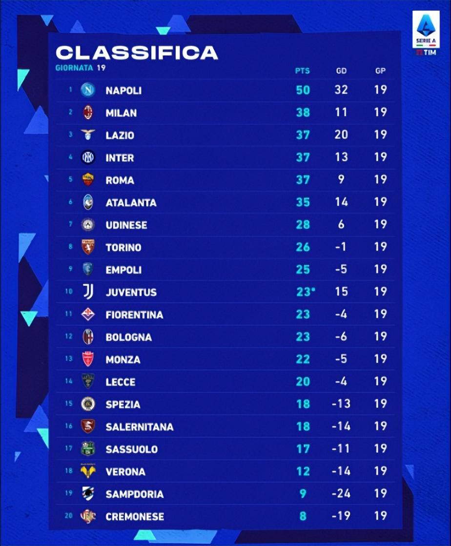近三輪不勝的AC米蘭仍然能坐穩意甲第二的位置,但他們已經被榜首球隊那不勒斯拉開12分的差距。排在那不勒斯身後的第2名到第6名,這5支球隊之間的最大分差只有3分,其中拉齊奧、國米和羅馬同積37分,跟AC米蘭只有1分的差距;而排名第6的亞特蘭大跟身前的3支隊只差2分其實,就一場球的事兒。