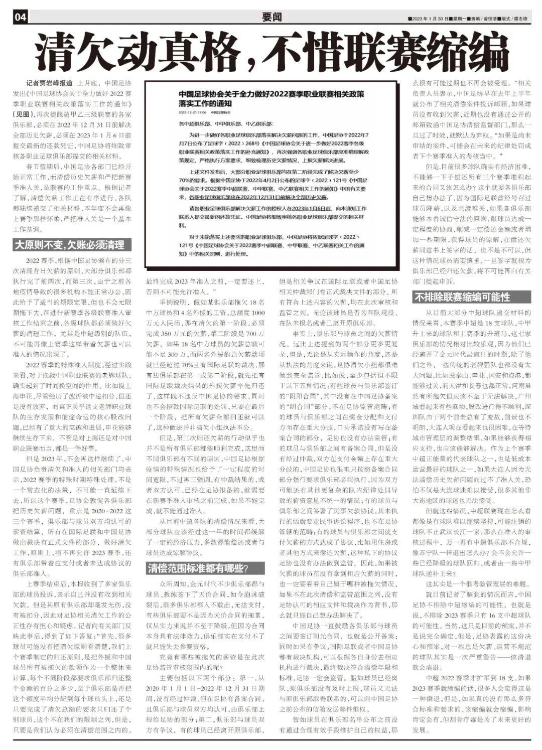 記者賈巖峯報道 上月底,中國足協發出《中國足球協會關於全力做好2022賽季職業聯賽相關政策落實工作的通知》,再次提醒超甲乙三級聯賽的各傢俱樂部,必須在2022年12月31日前解決全部歷史欠薪,必須在2023年1月6日前提交最新的還款憑證,中國足協將細緻審覈各職業足球俱樂部提交的相關材料。