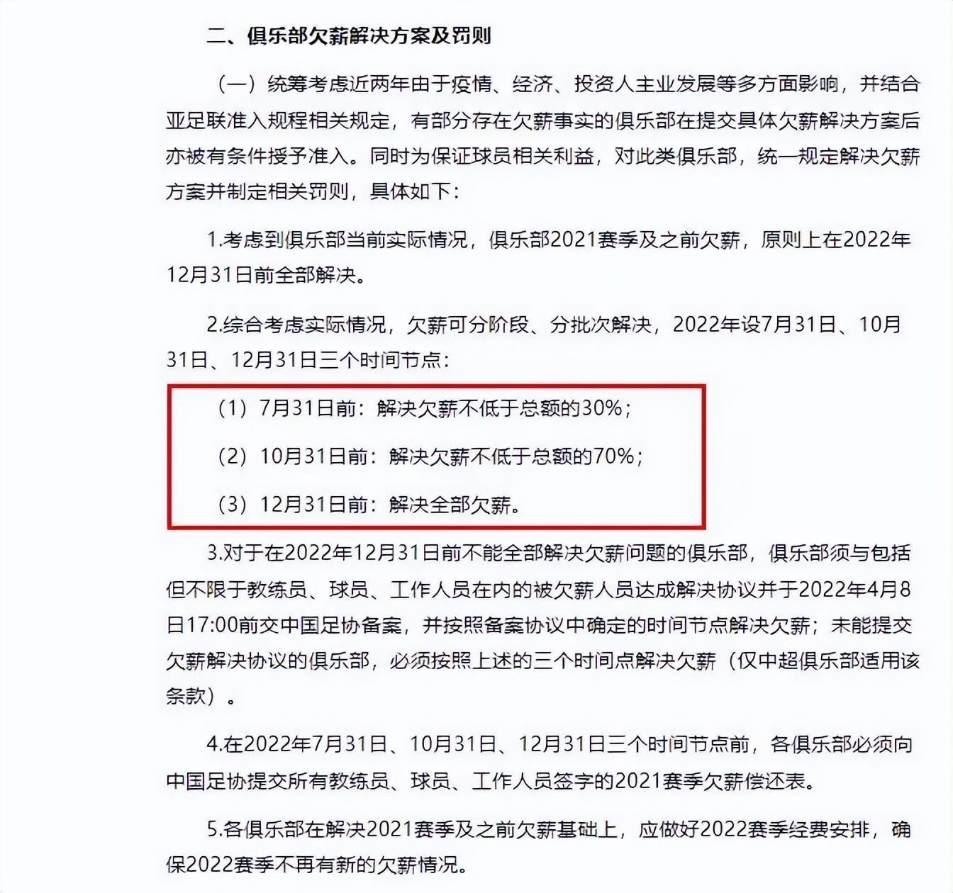 2022賽季,根據中國足協頒佈的分三次清理昔日欠薪的原則,大部分俱樂部都執行完了前兩次,而第三次,由於之前各地疫情導致的很多機構不能正常辦公,因此給予了適當的期限寬限,但也不會無限期拖下去,在進行新賽季各級聯賽准入審覈工作結束之前,各級球隊都必須做好欠薪的清理工作,尤其是中超級別的隊伍,不可能再像上賽季這樣帶着欠薪也可以准入的情況出現了。