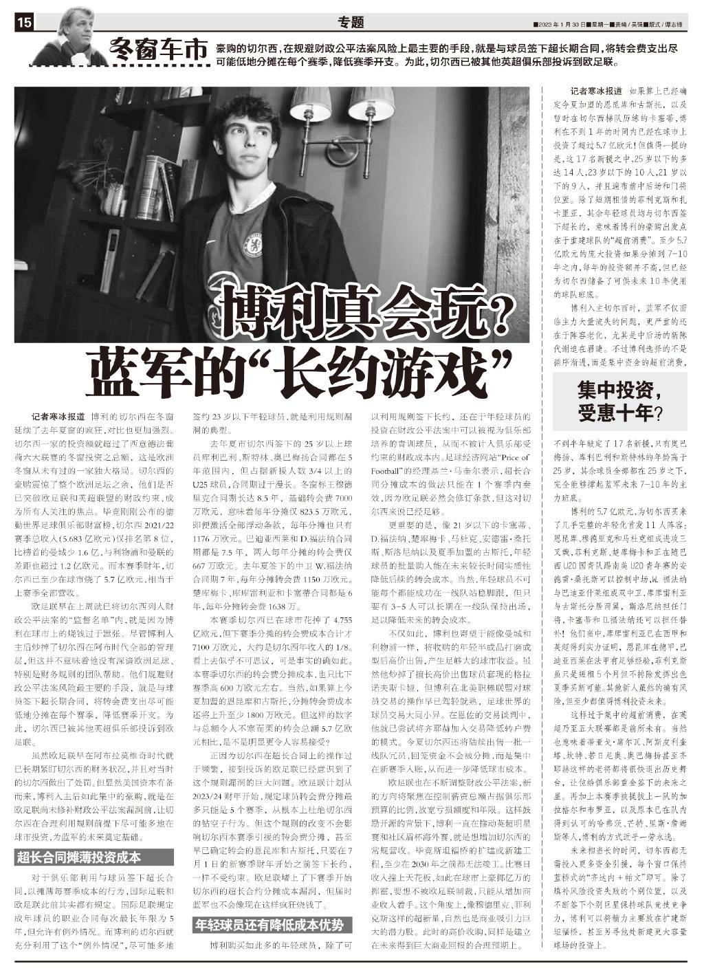 不僅如此,博利也寄望於能像曼城和利物浦一樣,將收購的年輕半成品打磨成型後高價出售,產生足夠大的球市收益。雖然他炒掉了擅長高價出售球員套現的格拉諾夫斯卡婭,但博利在北美職棒聯盟對球員交易的操作早已駕輕就熟,足球世界的球員交易大同小異。在恩佐的交易談判中,他就已嘗試將齊耶赫加入交易降低轉戶費的模式。今夏切爾西還將陸續出售一批一線隊冗員,回籠資金不會被分攤,而是集中在新賽季入賬,從而進一步降低球市成本。