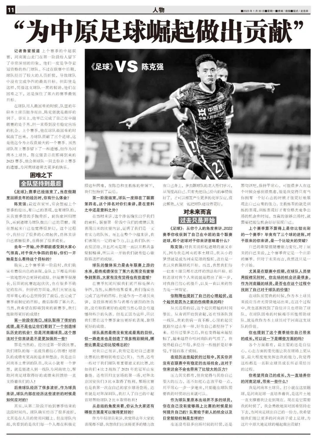 陳克強:對我來說那粒進球的意義非凡,因爲我是河南的本土球員,我從小的夢想就是成爲河南足球的旗幟,這也是一直以來我踢球的目標。而且,我想我們每一位本土球員都有這樣的想法和目標。那粒進球對我個人來說就是跨出了第一步,對我自己信心的提升,以及一直以來的努力是一種肯定。