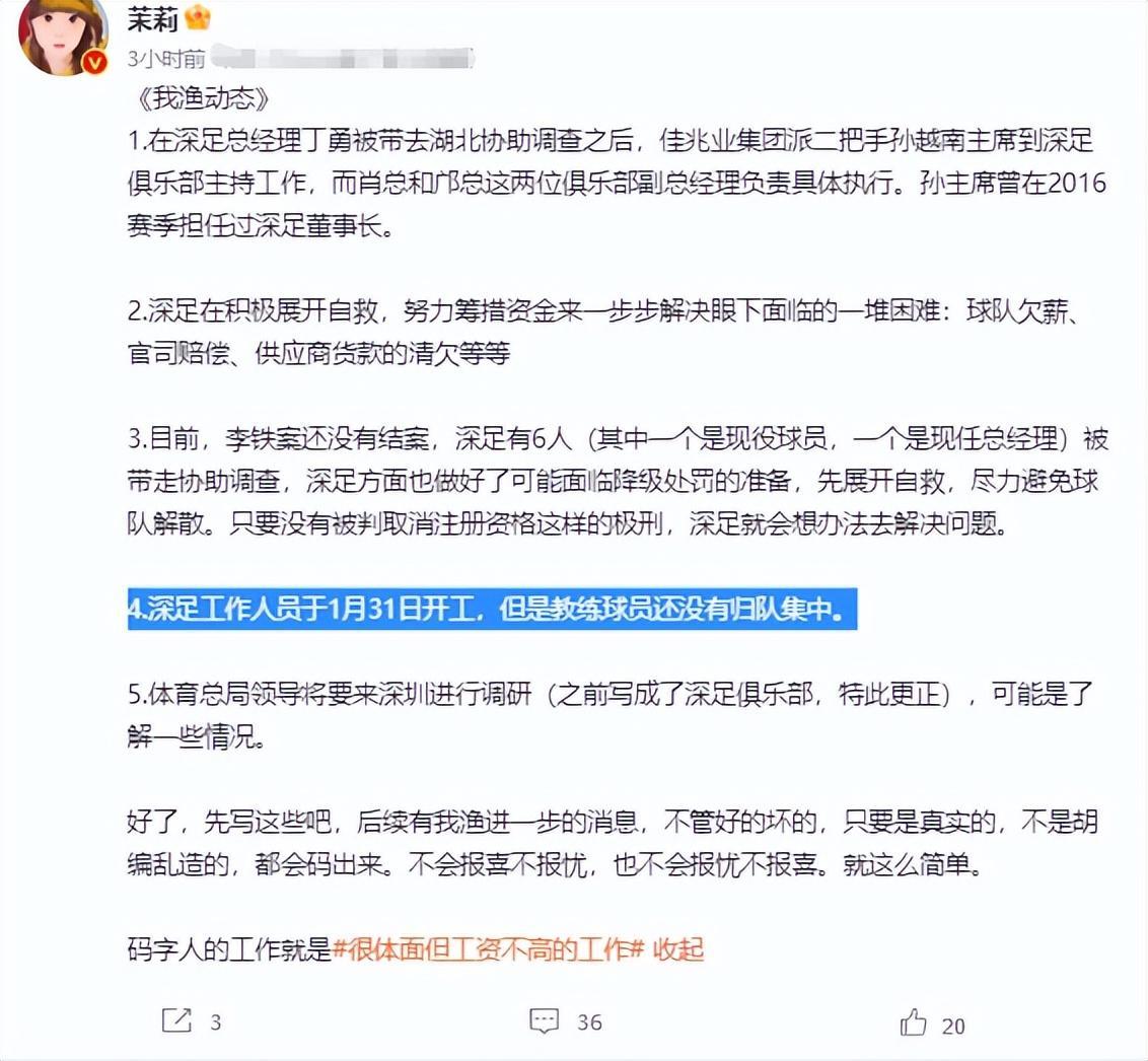 北京時間2月3日,記者程文莉稱,深圳隊再次收到被執行信息,加上俱樂部6人被捲入李鐵案中,可謂命途多舛。