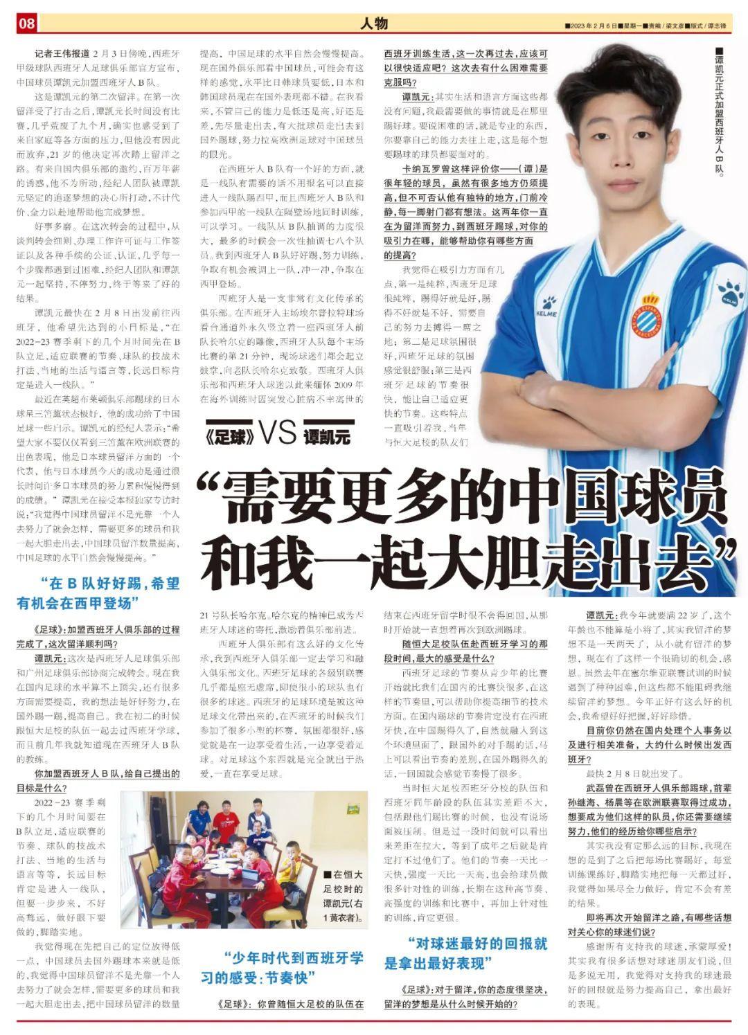 譚凱元:這次是西班牙人足球俱樂部和廣州足球俱樂部協商完成轉會。現在我在國內足球的水平算不上頂尖,還有很多方面需要提高,我的想法是好好努力,在國外踢一踢,提高自己。我在初二的時候跟恆大足校的隊伍一起去過西班牙學球,而且前幾年我就知道現在西班牙人B隊的教練。