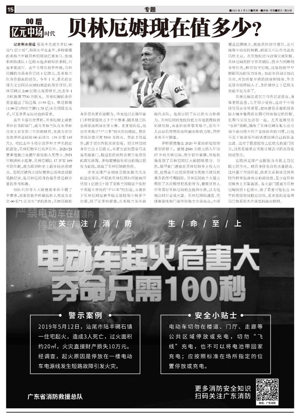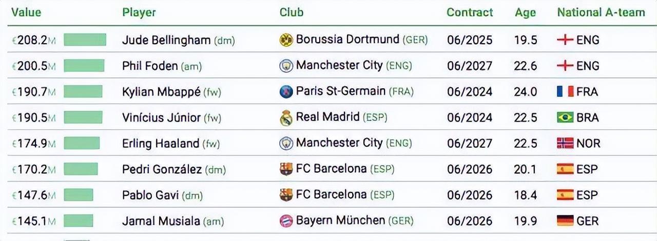 記者寒冰報道 恩佐率先成爲首位00後“1億中場”,但其實早在去年,多特蒙德的英格蘭中超貝林厄姆就已被皇馬、曼城和利物浦以1億歐元起步的報價求購,只是未能成行。去年卡塔爾世界盃前,貝林厄姆的市場身價已達1億歐元,是英格蘭隊身價最高的球員。今年1月,著名的足球天文臺網站(CIES)做出的身價評估,貝林厄姆以2.08億歐元高居榜首,比去年1月時激增7700萬歐元。貝林厄姆的身價甚至超過了姆巴佩(1.91億)、維尼修斯(1.90億)和哈蘭德(1.75億)3位頂級攻擊手,可見世界足壇對他的看重。