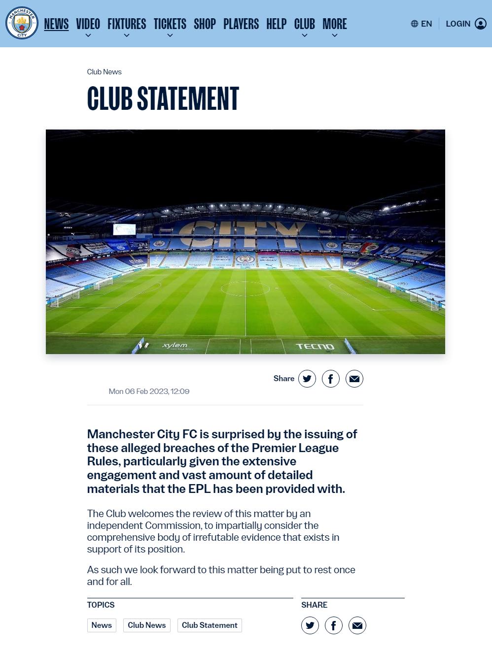 記者寒冰報道 2月6日對曼城而言,可能將是毀滅性打擊的開始。英超聯盟發表公告,聲稱曼城在2009/10賽季以來多次違反英超財務公平規則。對曼城俱樂部的違規指控超過100項,相關指控已移交給一個獨立調查委員會,英超聯盟將在調查結束後公佈處理結果。