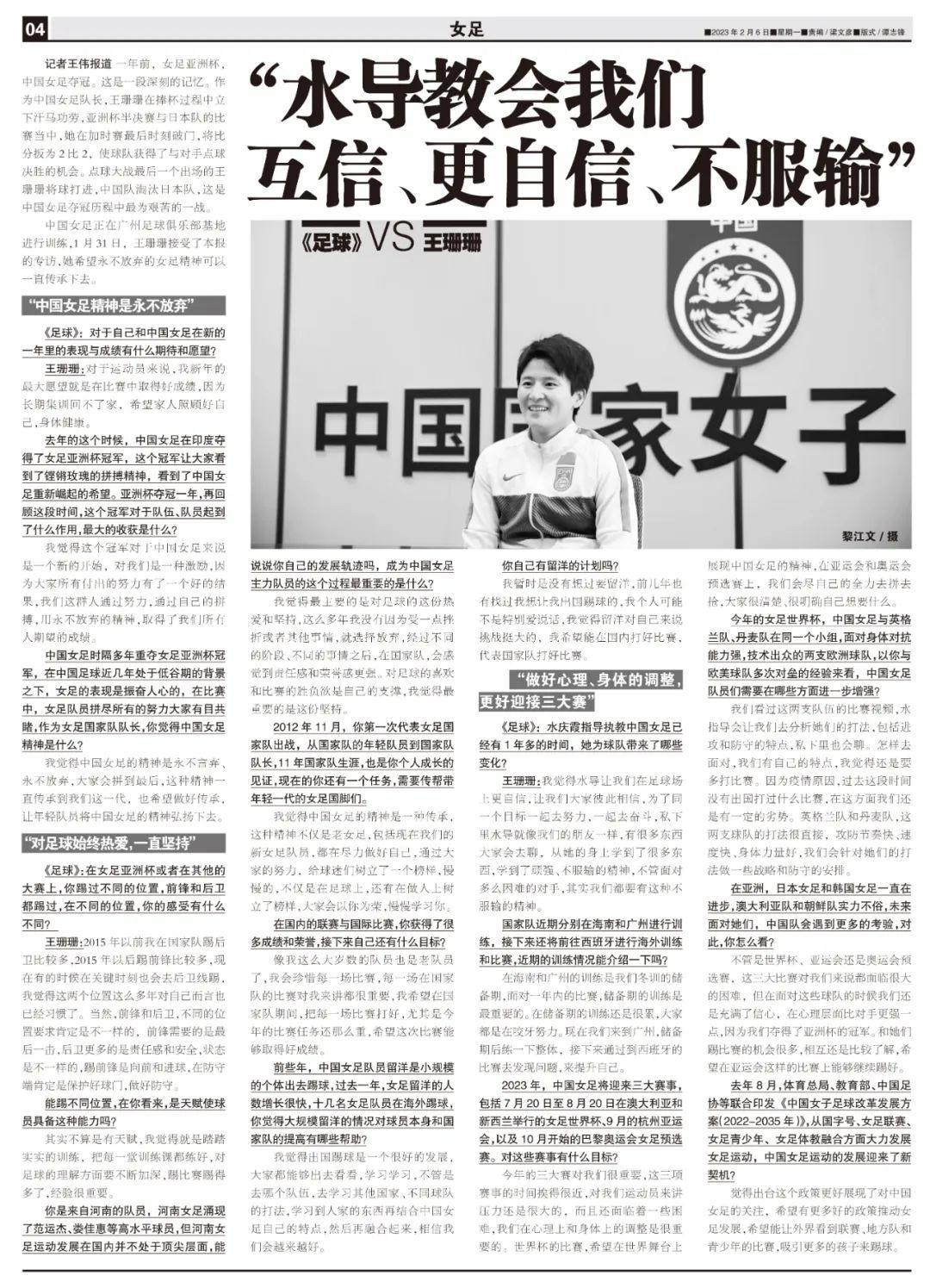王珊珊:我覺得水導讓我們在足球場上更自信,讓我們大家彼此相信,爲了同一個目標一起去努力,一起去奮鬥,私下裏水導就像我們的朋友一樣,有很多東西大家會去聊,從她的身上學到了很多東西,學到了頑強、不服輸的精神,不管面對多麼困難的對手,其實我們都要有這種不服輸的精神。
