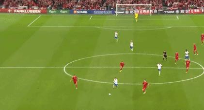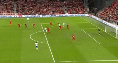 第34分鐘,達姆斯高左路傳中,多爾貝里門前剷射破門,丹麥1-0領先。