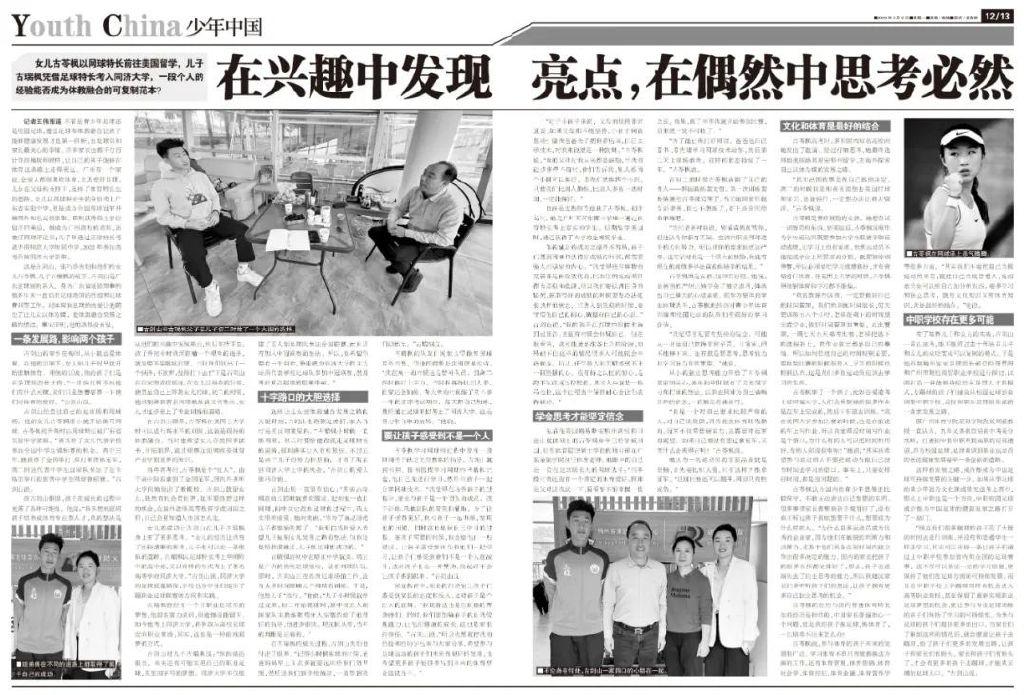 女兒的成功讓古劍山在兒子古瑞楓身上有了更多思考。“女兒的經歷讓我有了比較清晰的思考,兒子也可以走一條相似的道路。古瑞楓以足球特長考上華師附中的高中部,又以同樣的方式考上了著名高等學府同濟大學。”古劍山說。同濟大學的足球底蘊頗深,學校也爲學生們提供了踢職業足球聯賽的方向和實踐。