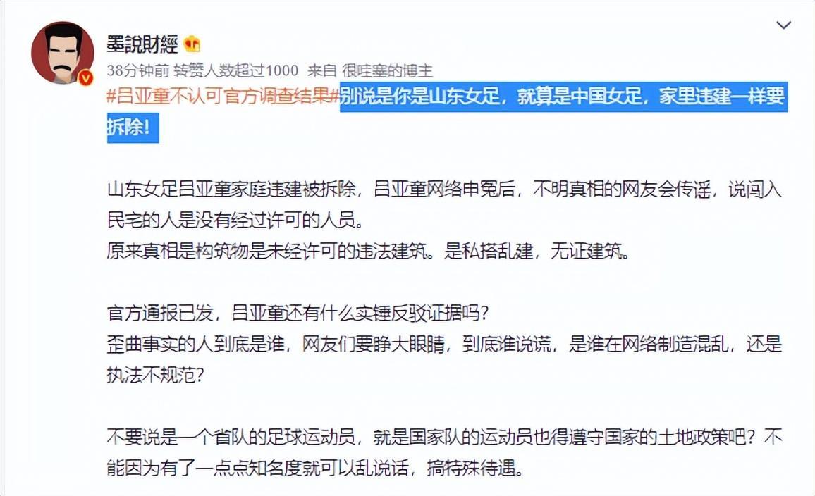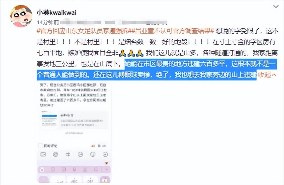 近日,山東女足球員呂亞童稱她家遭相關部門強制拆除,引起熱議。