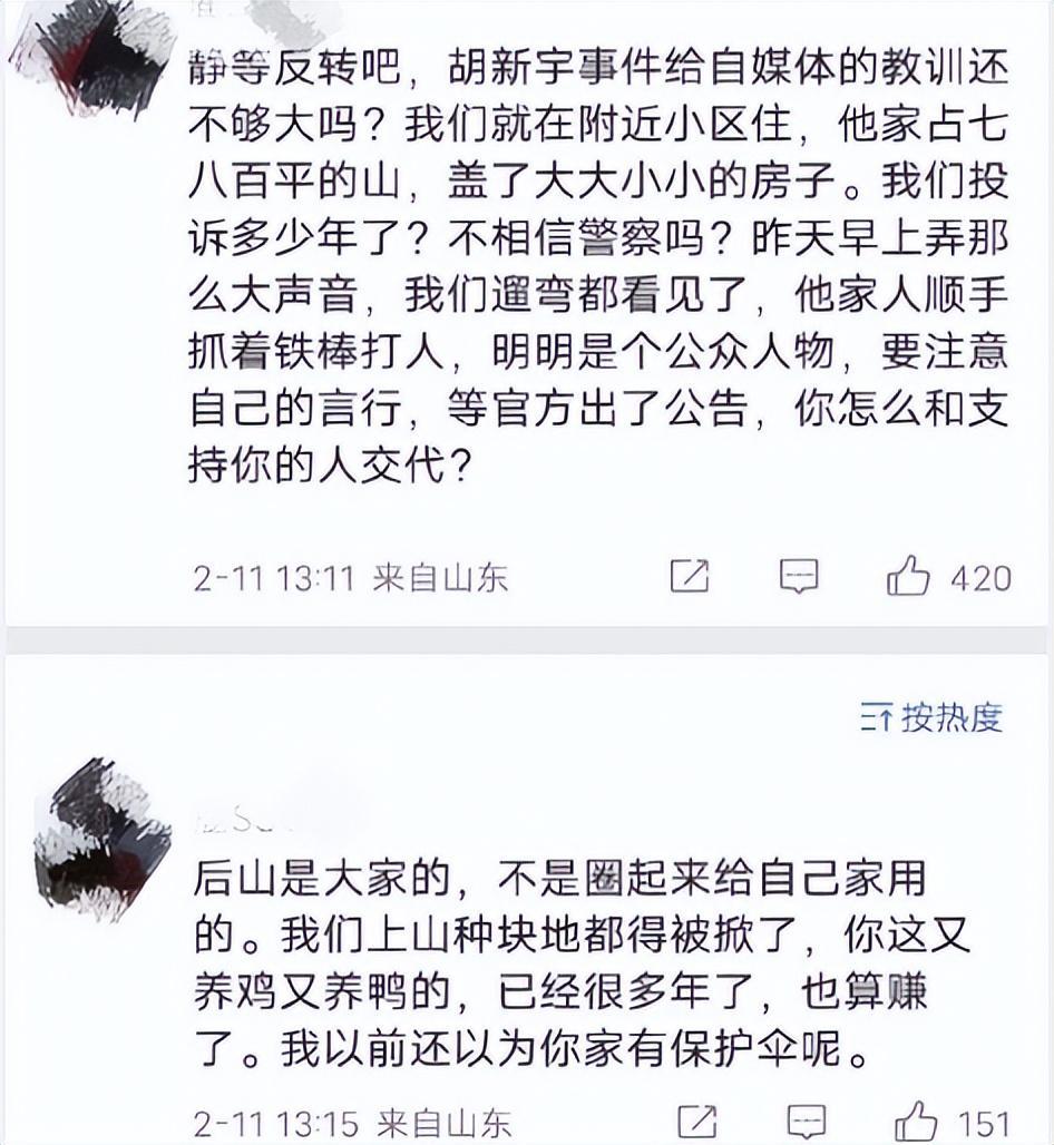 但從網友的評論來看,這件事似乎出現了反轉。不少在附近居住的網友留言稱,呂亞童家佔七八百平的山,蓋了大大小小的房子,附近的居民都投訴好幾年了。而且他們還看到呂亞童家跟執法人員發生爭執時順手抓着鐵棒打人。
