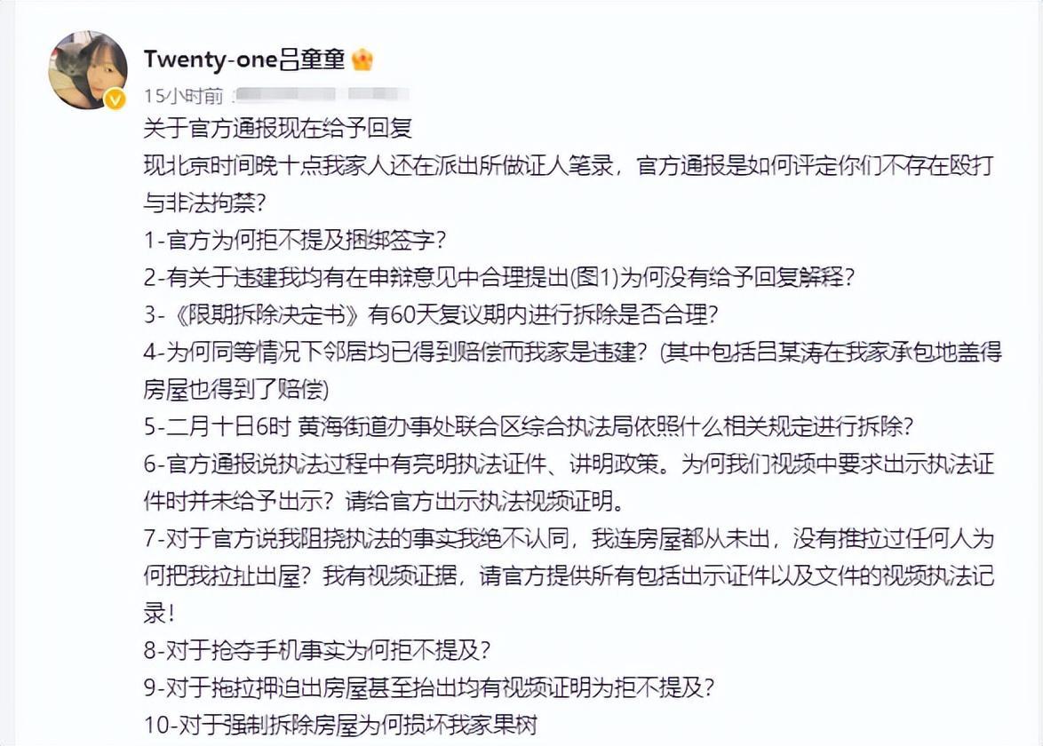 而呂亞童不認可官方調查結果,並提出了10條質疑。其中有一條,提到了錢的問題。呂亞童認爲別人家都獲得了賠償,而他們卻被認爲是違建遭強拆。