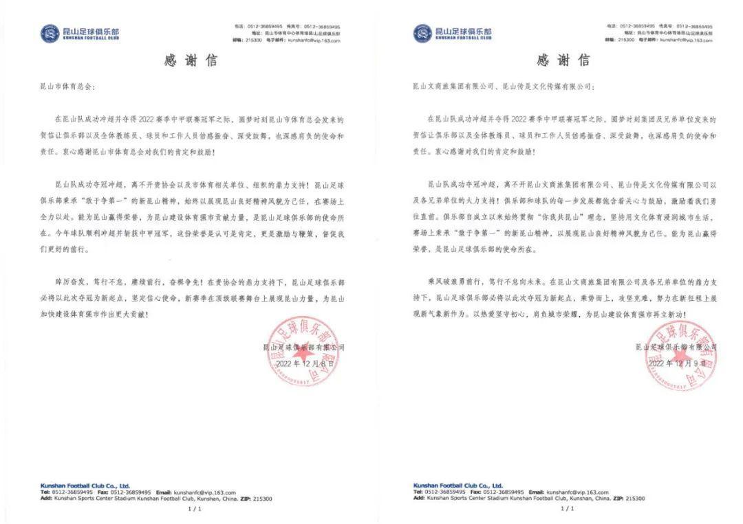 在青島海牛衝超成功之後,青島市委、市政府、市體育局都向俱樂部發出了賀信,南通支雲也收到了如皋市委、市政府發來的賀信。而拿到冠軍的崑山俱樂部,只是收到了崑山市體育總會(文體廣旅局的下屬體育單位)和崑山傳是文化傳媒的祝賀信。
