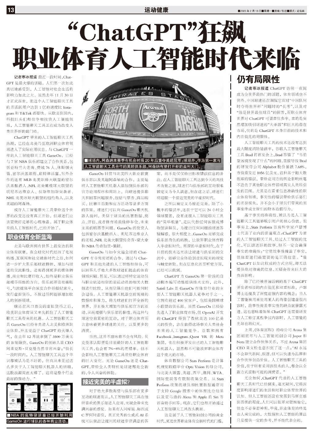 當然,這並不意味着不會有風險。貝克曼承認即便是目前最好的人工智能聊天工具,也會有7%-8%的差錯率。但不會影響人工智能聊天工具帶給職業體育的巨大變化。無論GameOn還是ChatGPT,帶給全人類特別是球迷都是全新的,令人興奮的體驗。