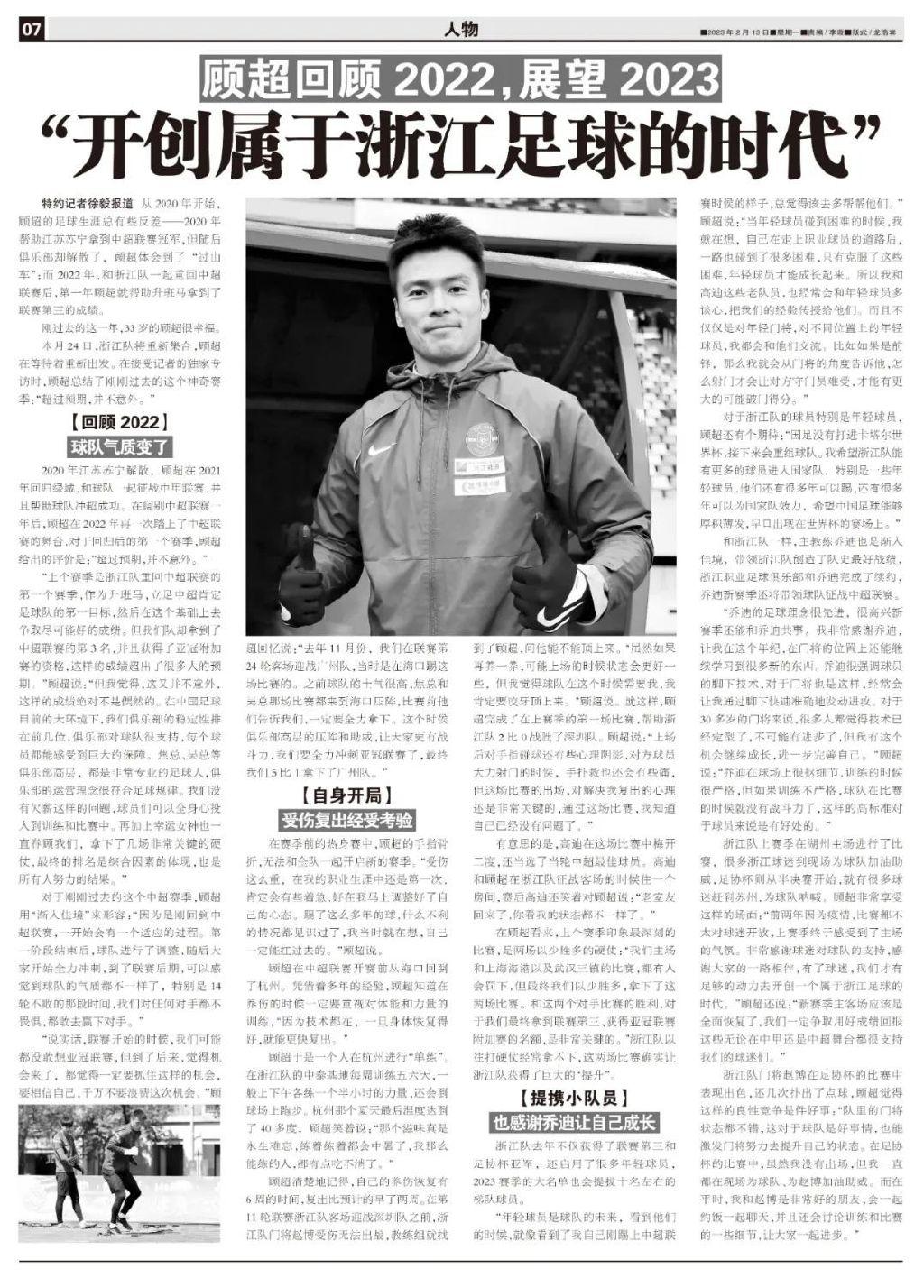 特約記者徐毅報道 從2020年開始,顧超的足球生涯總有些反差——2020年幫助江蘇蘇寧拿到中超聯賽冠軍,但隨後俱樂部卻解散了,顧超體會到了“過山車”;而2022年,和浙江隊一起重回中超聯賽後,第一年顧超就幫助升班馬拿到了聯賽第三的成績。