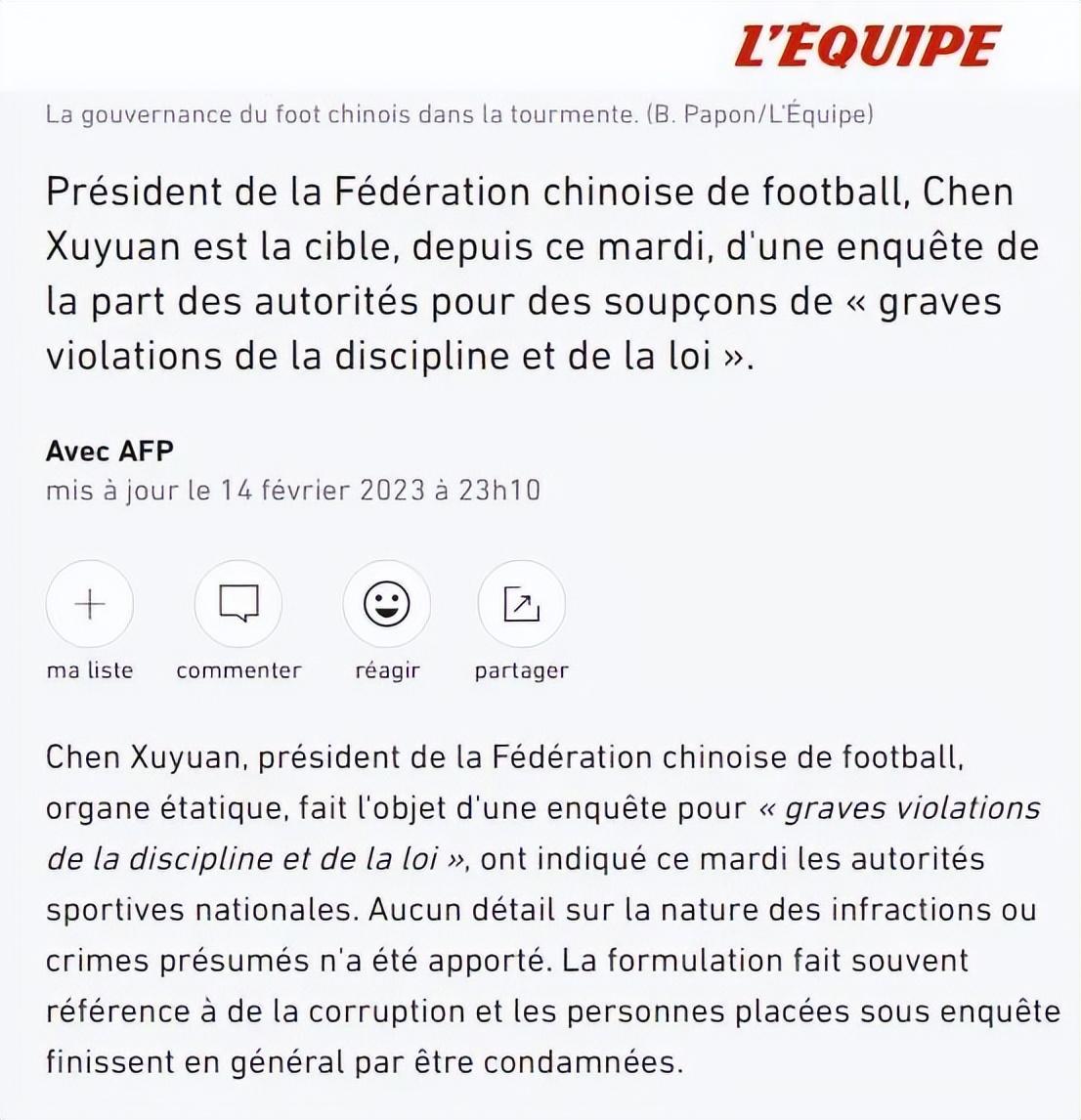 法國《隊報》在2月14日的報道中,援引國內的報道稱中國足協主席陳戌源因“嚴重違紀違法”正在接受調查,但沒有透露陳戌源被指控的具體罪行和詳細信息。《隊報》認爲類似的措辭通常指當事人的腐敗行爲,而接受調查的人通常最終都會被定罪。報道還指出去年11月中國國家隊前主帥李鐵已經因“嚴重違法”被調查,同樣沒有提供更多細節。