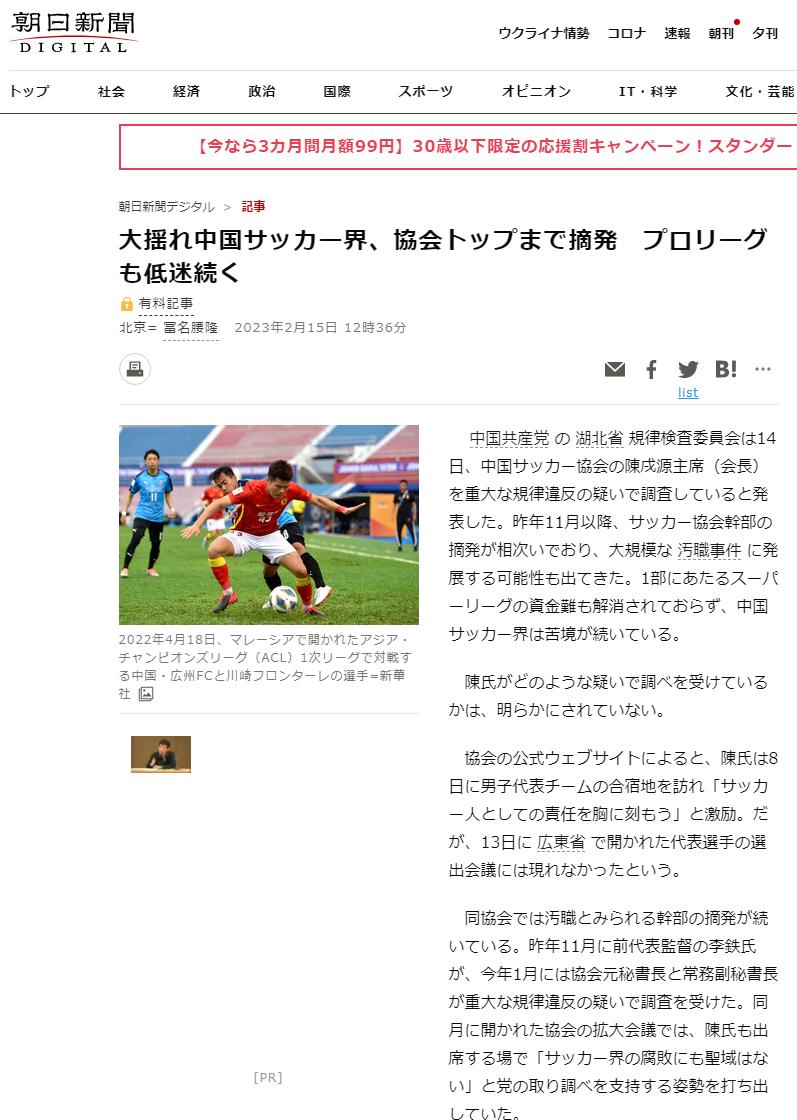 記者寒冰報道 中國足協主席陳戌源“涉嫌嚴重違紀違法”被查,不僅震動了中國足壇,也引發了國際社會對中國足球的關注。包括法國《隊報》、英國《金融時報》、美國彭博社、德新社、意大利《共和報》、葡萄牙《競賽報》、荷蘭《電信報》、比利時《新聞報》、日本《朝日新聞》在內的主流媒體都進行了報道,這是繼2020年中超金元足球泡沫破裂和2021年中國足球的歸化進程失敗後,中國足球再次引起國際媒體的普遍報道。