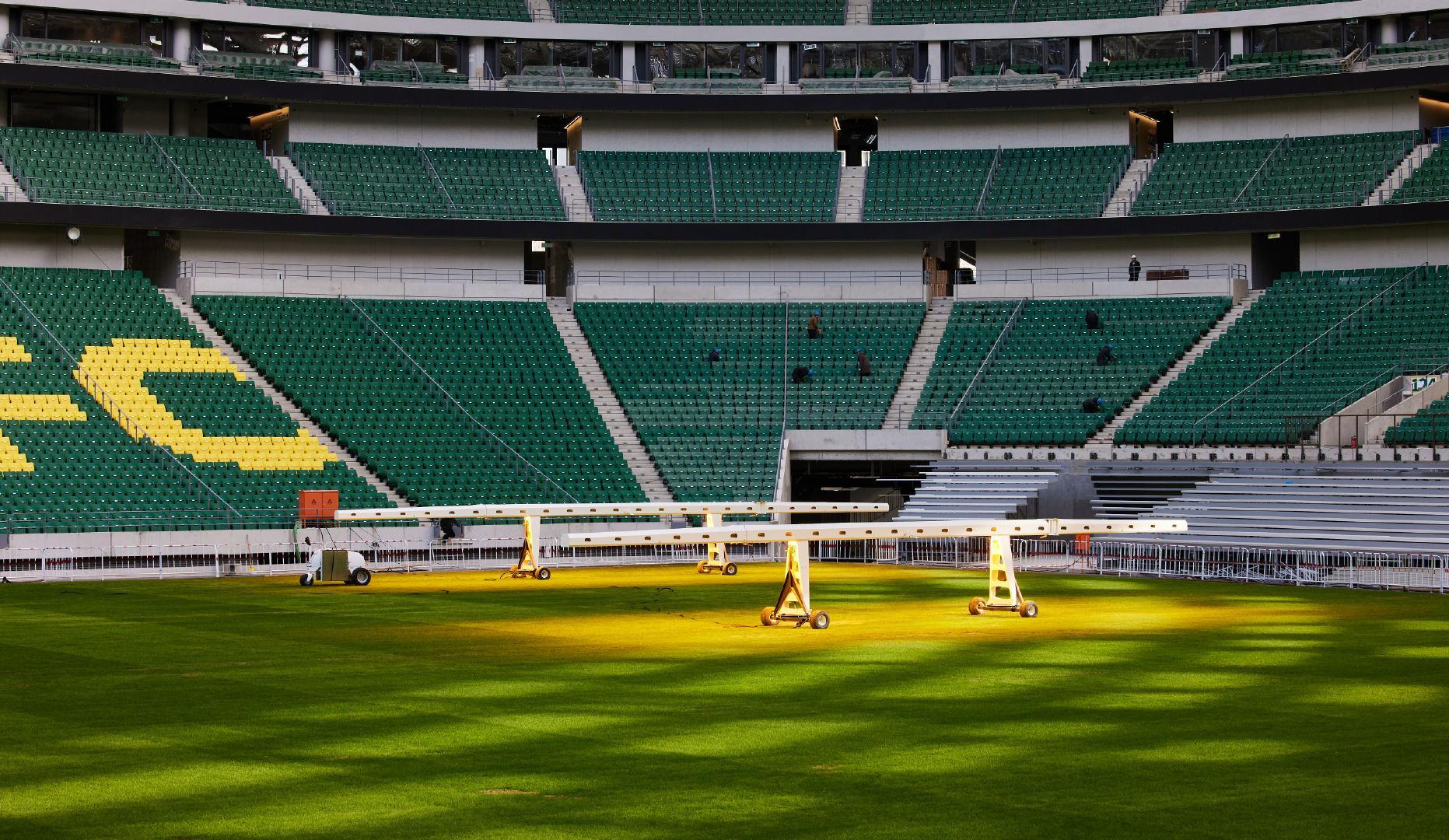 新工體的足球場草坪已經鋪設完畢,正處於養護階段。草皮系統是國際主流的錨固草系統,設有地下通風、地暖加熱和自動噴灌裝置,符合承接世界盃和洲際大賽的標準。智能補光組目前正在工體內工作,參照草皮生長的最適宜環境參數,根據場館內遮光程度的不同進行補光養護。