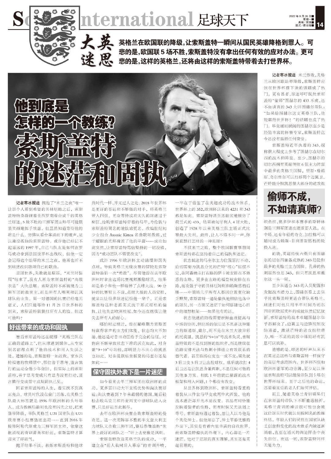或許1996年歐洲盃主動請纓卻罰失點球,導致英格蘭無緣決賽的冒險是索斯蓋特最後一次“勇敢”。儘管他曾在去年歐洲盃時拿出這場比賽視頻激勵球員,結果卻是弟子和他一樣輸掉了點球大戰。90分鐘的比賽暫且不說,點球大戰的人員安排,就足以讓很多球迷記恨他一輩子。正是索斯蓋特這種老派英式流於形式桎梏的偏執,讓他失去歐洲桂冠,如今還在繼續讓他失去所有人的耐心。