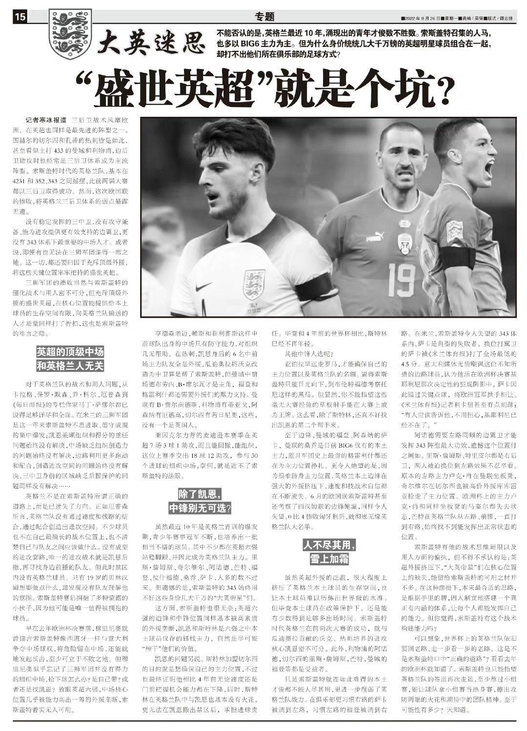 對於英格蘭隊的戰術和用人問題,從卡拉格、保羅·默森、喬·科爾、厄普森到《每日郵報》的專欄作家馬丁·薩繆爾都已說得足夠詳盡和全面。在米蘭的三獅軍團是這一年來索斯蓋特不思進取、墨守成規的集中爆發:凱恩兼顧組織和得分的重任問題始終沒有解決,中場缺乏組織創造力的問題始終沒有解決,邊路利用更多跑動和配合,創造進攻空間的問題始終沒有解決,三中衛身前的區域缺乏後腰保護的問題同樣沒有解決……