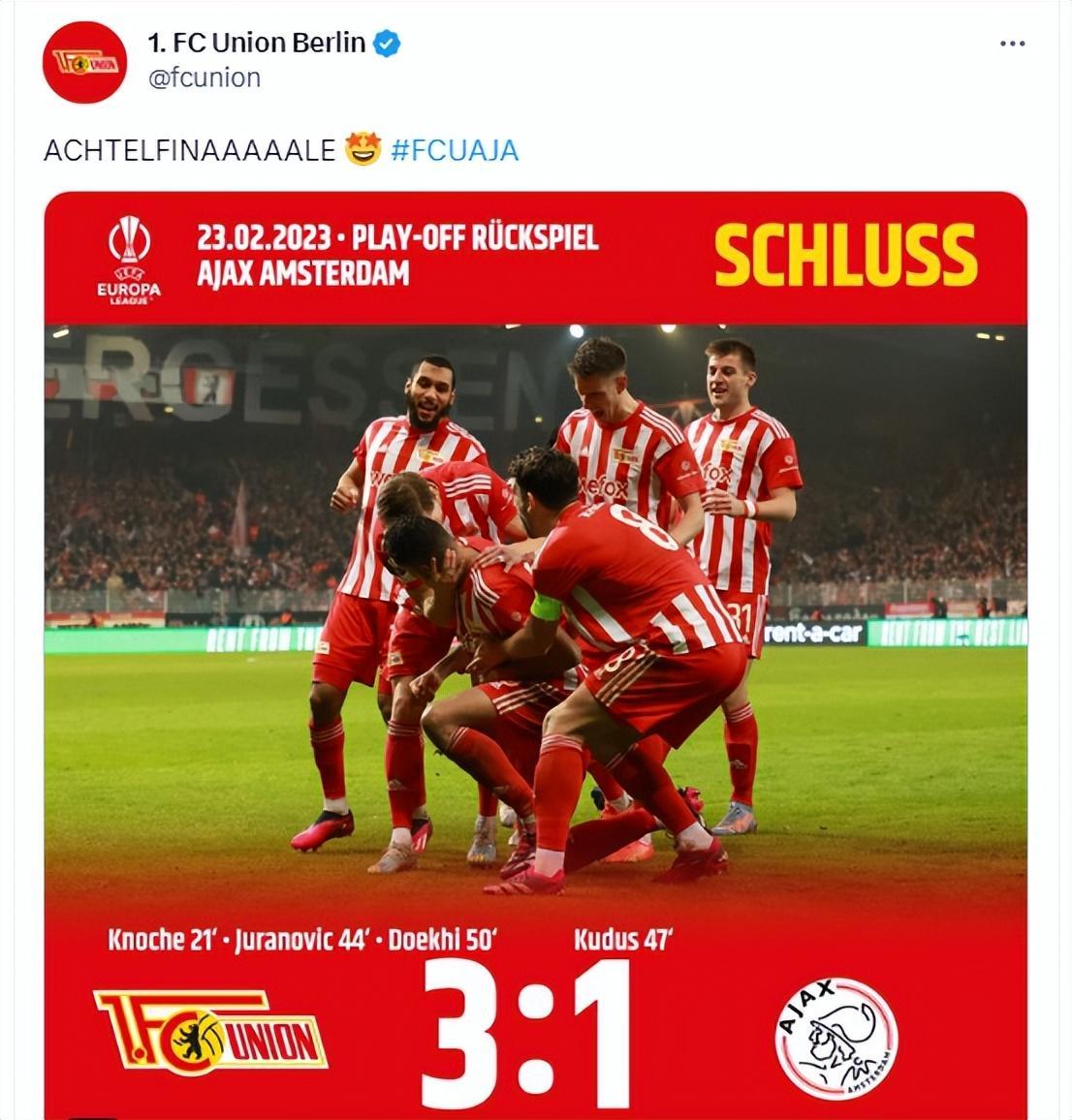 柏林聯合主場3-1阿賈克斯,總比分3-1晉級