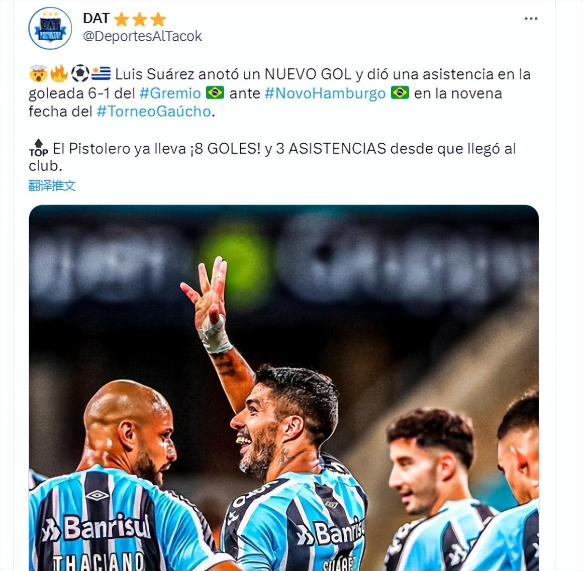 北京時間2月25日,巴西南大河州聯賽第9輪,36歲的蘇亞雷斯在第84分鐘打進一球,最終幫助格雷米奧主場6-1大勝諾沃漢伯格。