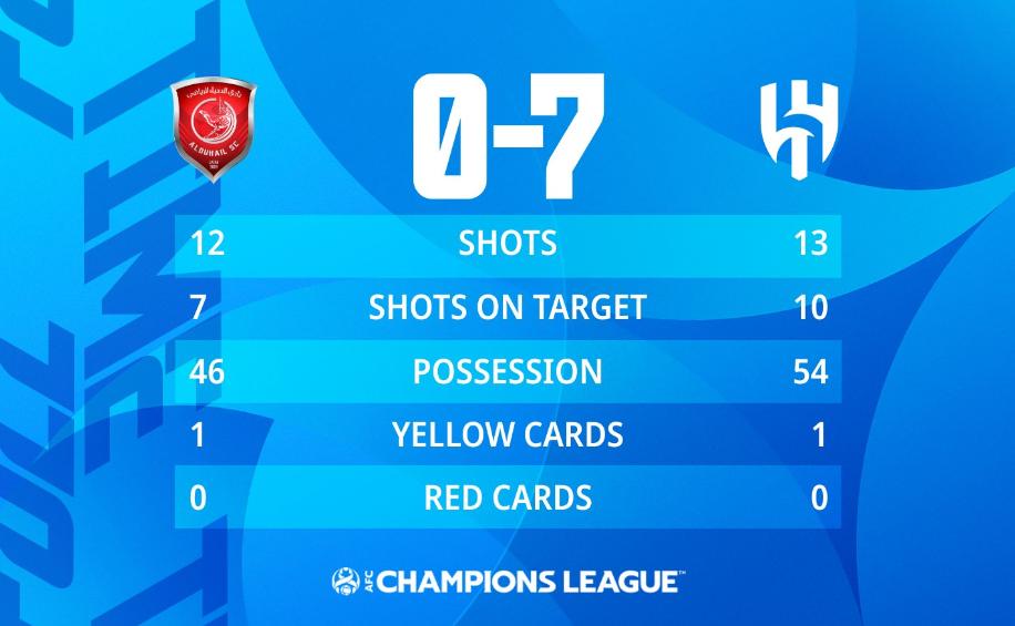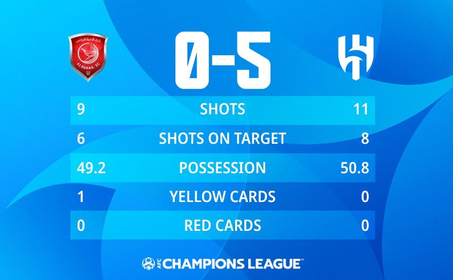 7-0大勝杜海勒這一場比賽,利雅得新月只用13次射門10次射正便打進7球,伊哈洛只用了6次射門便完成了大四喜。這一場7-0,讓利雅得新月創造了隊史亞冠最大比分勝利紀錄,打破了此前他們在2012賽季亞冠1/8決賽面對海灣聯賽球隊班尼亞斯時創造的紀錄(7-1)。