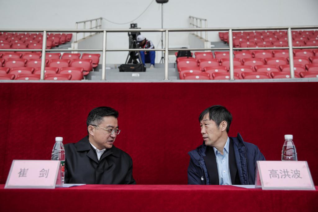 廣東省體育局局長崔劍和中國足協副主席高洪波到肇慶市體育中心現場觀看比賽