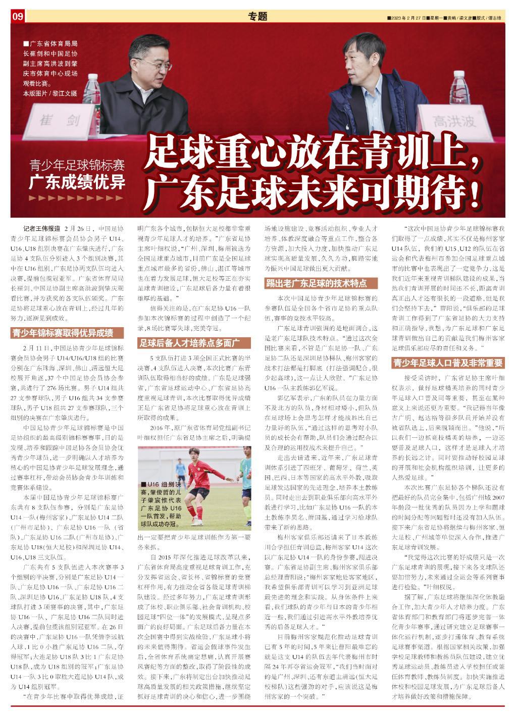 自2015年深化推進足球改革以來,廣東省體育局高度重視足球青訓工作,充分發揮省運會、省長杯、省錦標賽的競賽槓桿作用,有力推動全省各級足球青訓梯隊建設。經過多年努力,廣東足球青訓形成了體校、職業俱樂部、社會青訓機構、校園足球“四位一體”的發展模式,呈現點多面廣的良好局面。廣東足球后備力量在本次全國賽中得到實戰檢驗,廣東足球小將的未來值得期待。省運會假球事件發生後,全省體育系統痛定思痛,認真開展賽風賽紀等方面的整改,取得了階段性的成效。接下來,廣東將制定出臺加快推動足球高質量發展的相關政策措施,繼續堅定抓好足球青訓的決心和信心,進一步圍繞場地設施建設、競賽活動組織、專業人才培養、體教深度融合等重點工作,整合各方資源,加大投入力度,加快推動廣東足球實現高質量發展,久久爲功,腳踏實地爲振興中國足球做出更大貢獻。