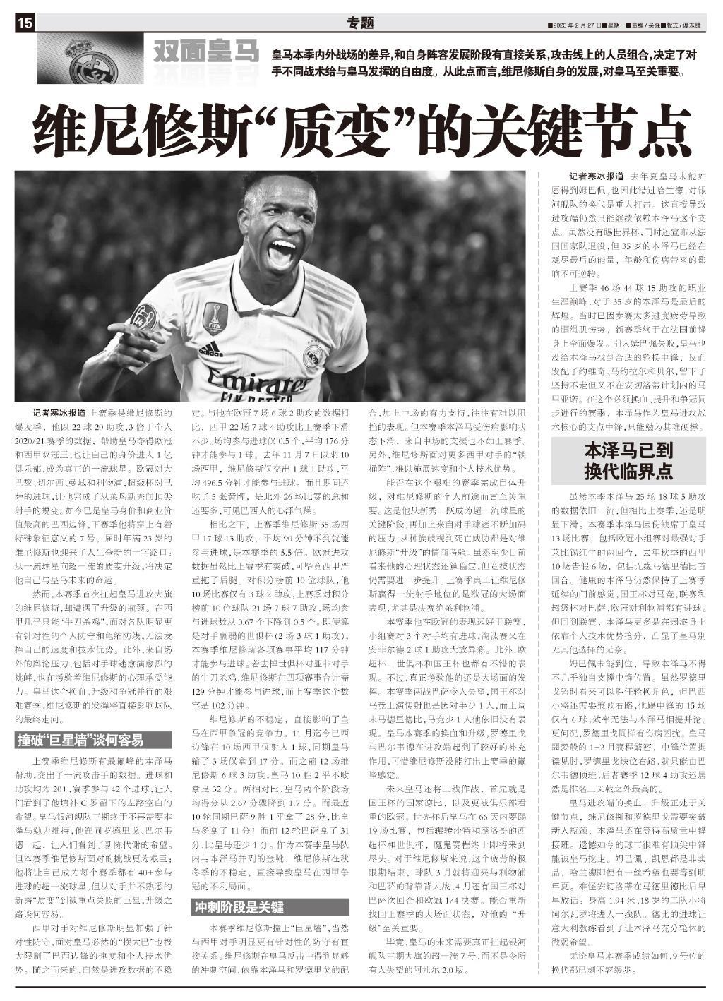 記者寒冰報道 上賽季是維尼修斯的爆發季,他以22球20助攻,3倍於個人2020/21賽季的數據,幫助皇馬奪得歐冠和西甲雙冠王,也讓自己的身價進入1億俱樂部,成爲真正的一流球星。歐冠對大巴黎、切爾西、曼城和利物浦,超級盃對巴薩的進球,讓他完成了從菜鳥新秀向頂尖射手的蛻變。如今已是皇馬身價和商業價值最高的巴西邊鋒,下賽季他將穿上有着特殊象徵意義的7號,屆時年滿23歲的維尼修斯也迎來了人生全新的十字路口:從一流球星向超一流的質變升級,將決定他自己與皇馬未來的命運。