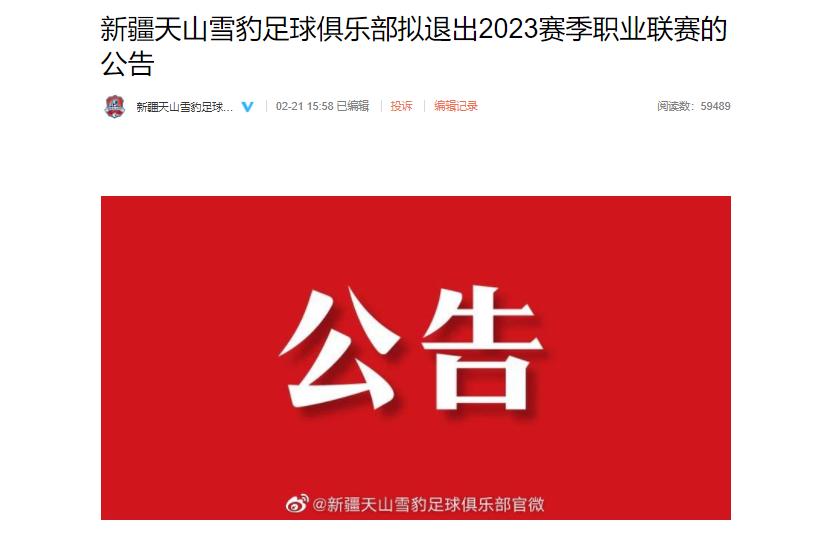 在新疆天山雪豹申請退出2023賽季中國足球職業聯賽之後,新疆男籃也發佈公告,決定退出本賽季比賽以及退出CBA聯盟。