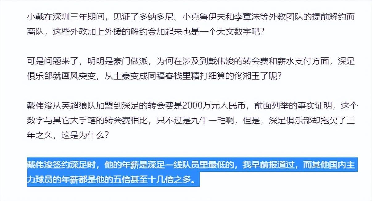 足球報國內部主任李璇得到的消息稱,深圳隊對戴偉浚的要價是1000萬,只是當時從狼隊引進他時的一半價格。這1000萬里面,有部分是戴偉浚的欠薪,有部分是拖欠狼隊三年的剩餘轉會費。