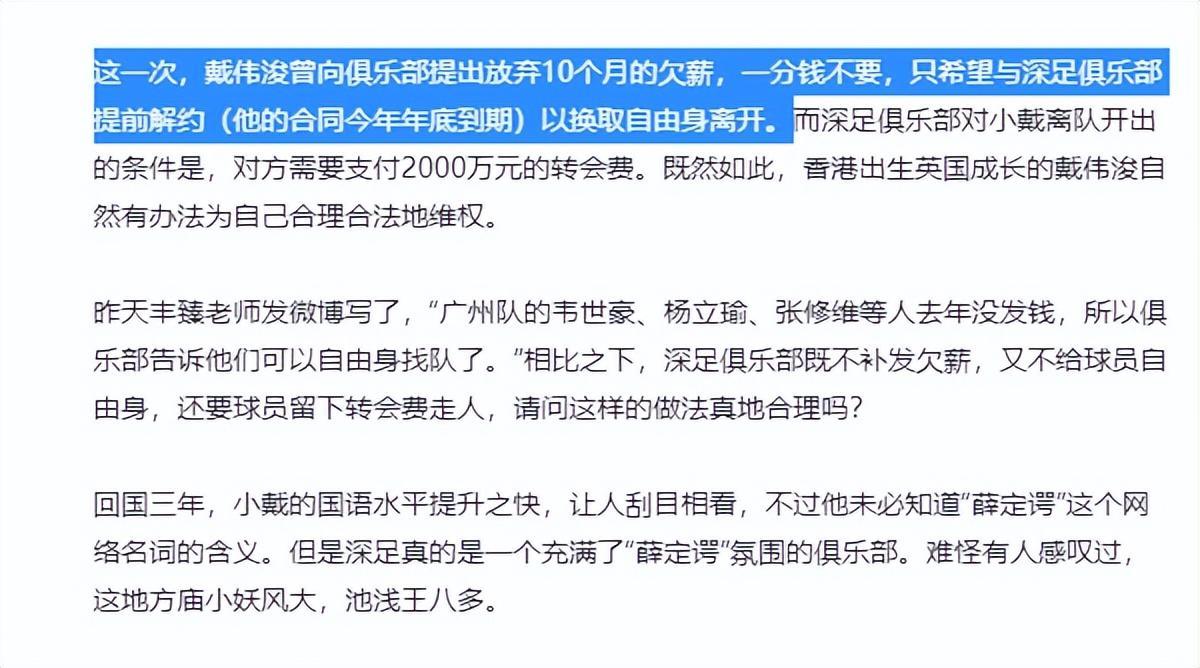 據瞭解,戴偉浚跟深圳隊的合同到今年年底到期,球員已經向俱樂部提出放棄10個月欠薪,換取恢復自由身,但深圳隊方面要求要收到2000萬的轉會費才肯放人。