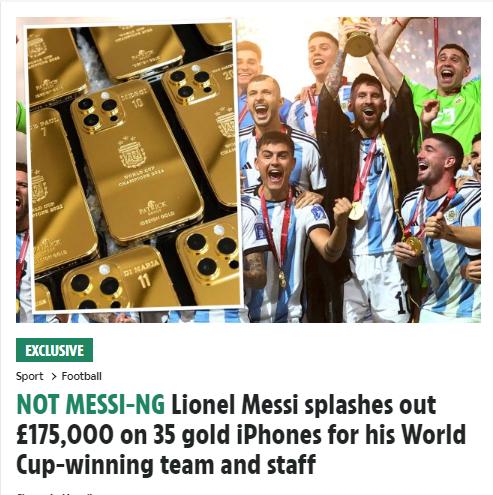 北京時間3月2日,《太陽報》報道稱,在阿根廷奪得世界盃冠軍後,35歲的梅西自掏腰包爲世界盃的國家隊隊友和工作人員定製了35部蘋果手機。據瞭解,這些定製版蘋果手機已於上週六送往梅西在巴黎的豪宅中。