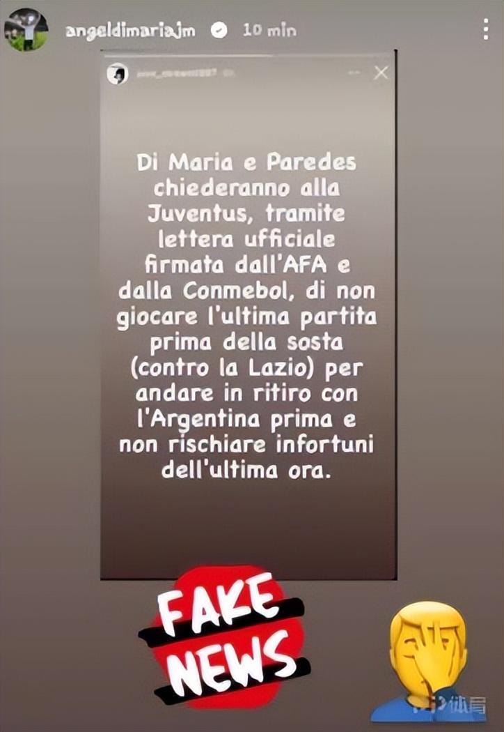 近日,有阿根廷媒體報道稱,阿根廷球員要求不出戰世界盃前的最後一輪聯賽,但是迪馬利亞對這一消息進行了闢謠。阿根廷媒體《dobleamarilla》報道稱,有球員已經向俱樂部提出請求,要求不參加世界盃前的最後一輪聯賽,而阿根廷足協打算也爲此向球員所在的俱樂部提出請求。有媒體表示,迪馬利亞與帕雷德斯已經向尤文正式提出書面請求,要求不出戰世界盃前對陣拉齊奧的最後一輪聯賽,避免受傷的風險。但是迪馬利亞在不久前更新了自己的Instagram,對這一消息進行了闢謠,他截圖並寫道:“假新聞。”