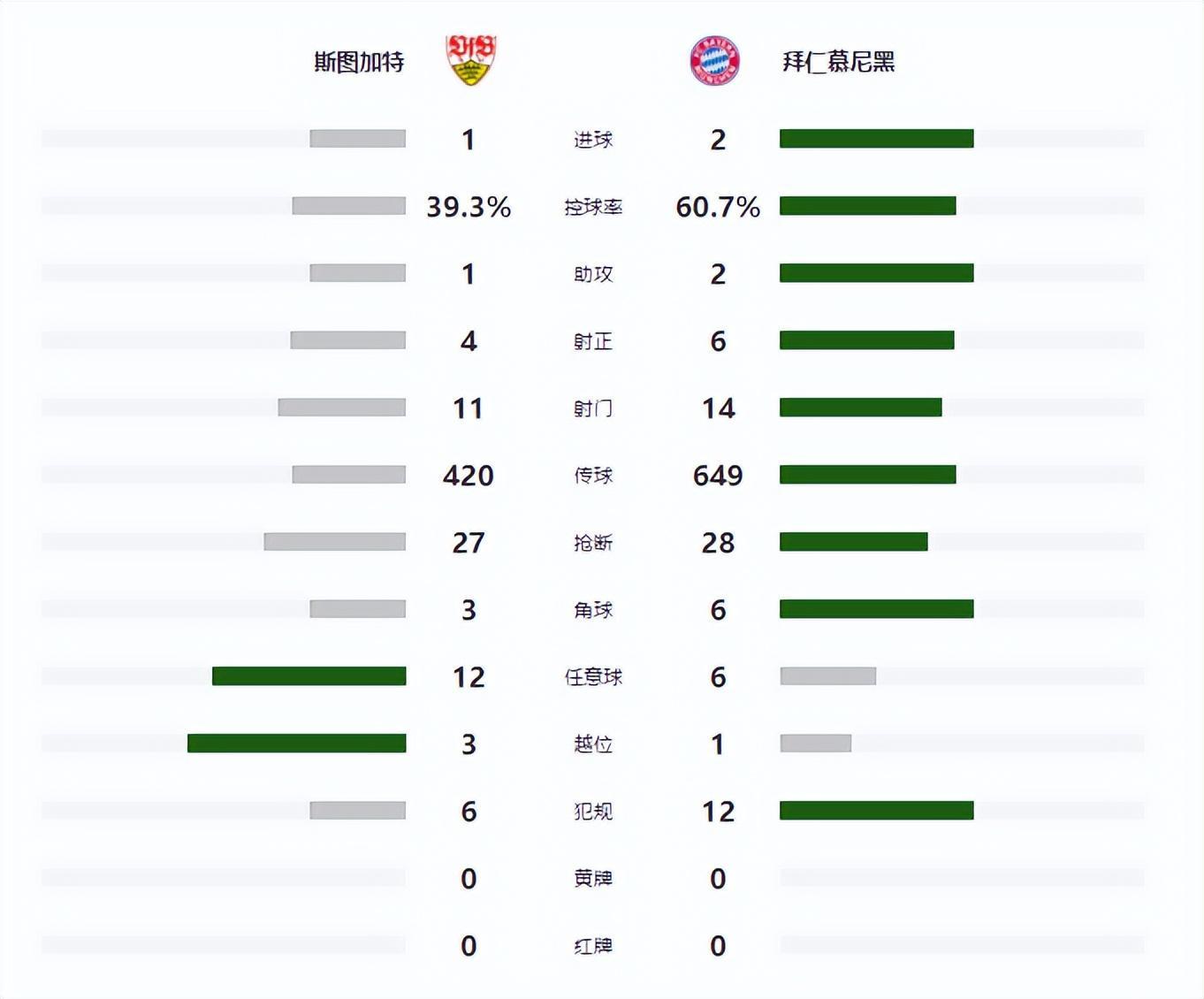 此後,雙方均無法再次改寫比分,最終拜仁2-1擊敗斯圖加特。