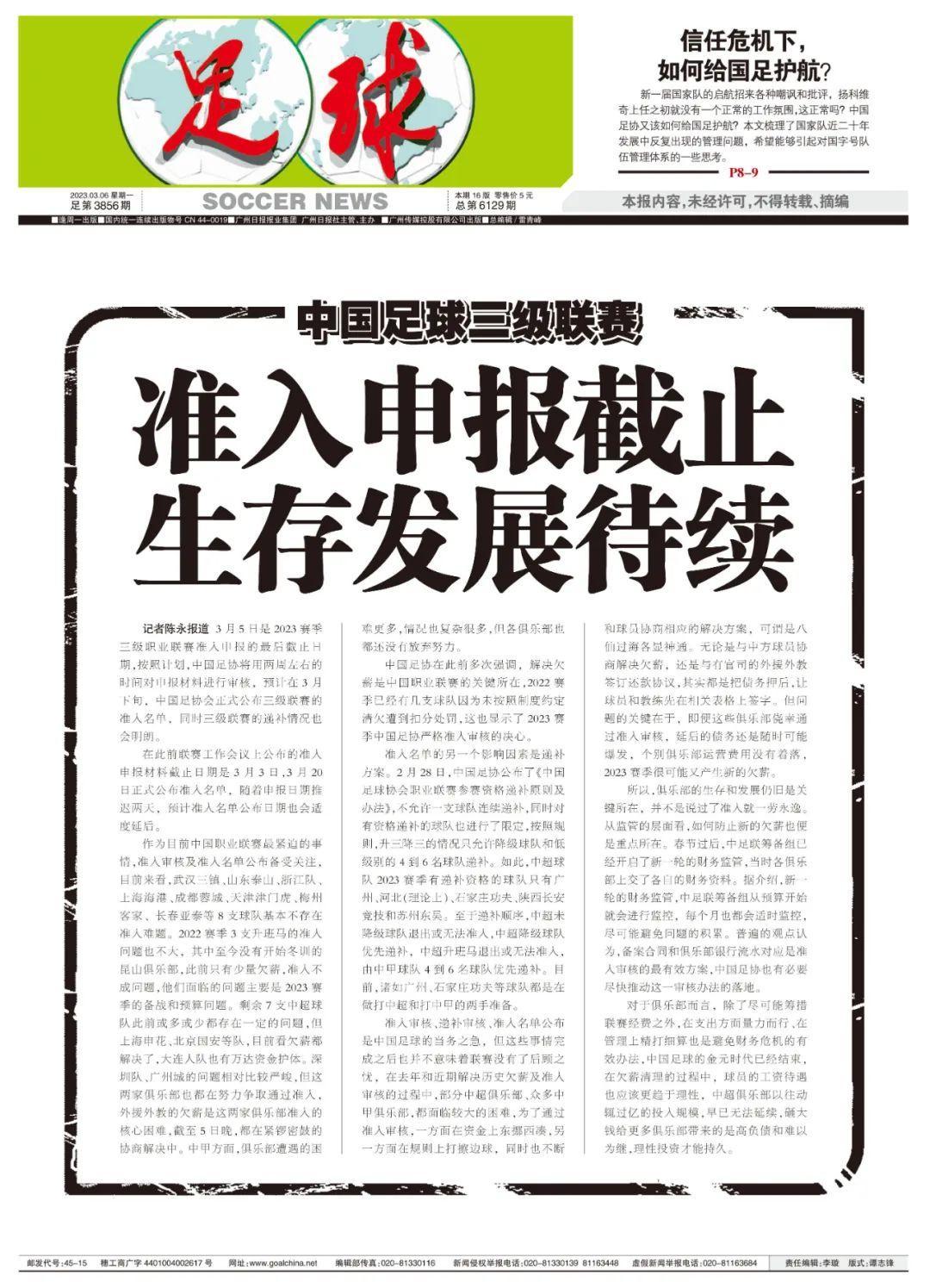 記者陳永評述 3月5日是2023賽季三級職業聯賽准入申報的最後截止日期,按照計劃,中國足協將用兩週左右的時間對申報材料進行審覈,預計在3月下旬,中國足協會正式公佈三級聯賽的准入名單,同時三級聯賽的遞補情況也會明朗。