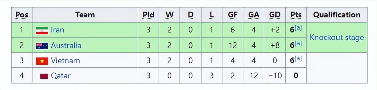 而最終B組最後一輪的兩場賽果時,澳大利亞9-1卡塔爾,越南1-3伊朗,最終伊朗、澳大利亞和越南同積6分,但伊朗的相互淨勝球爲+1,澳大利亞相互淨勝球爲0,而越南相互淨勝球爲-1,所以伊朗和澳大利亞分別以小組第一和小組第二齣線,越南以小組第三齣局。