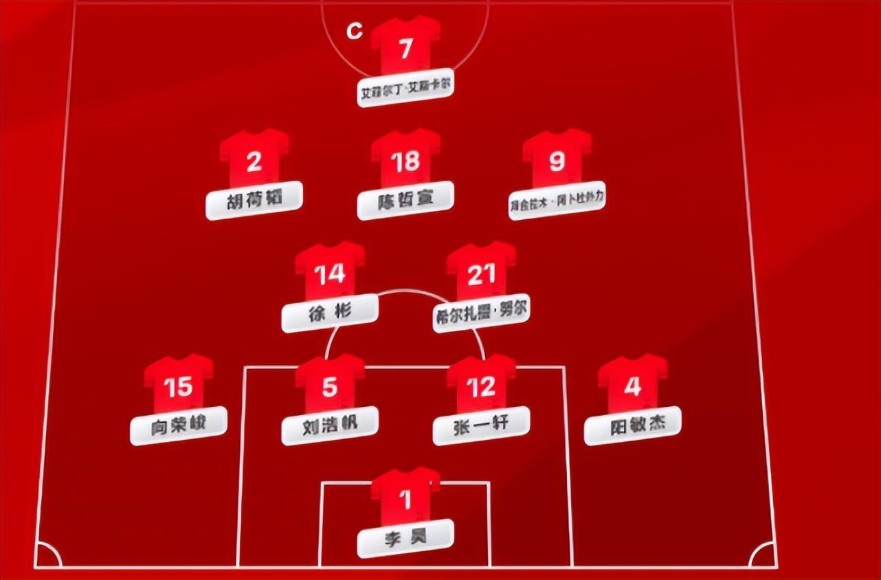 中國U20首發:1-李昊;4-陽敏傑、5-劉浩帆、12-張一軒、15-向榮峻;14-徐彬、21-希爾扎提-努爾;2-胡荷韜、18-陳哲宣、9-拜合拉木-阿卜杜外力;7-艾菲爾丁-艾斯卡爾