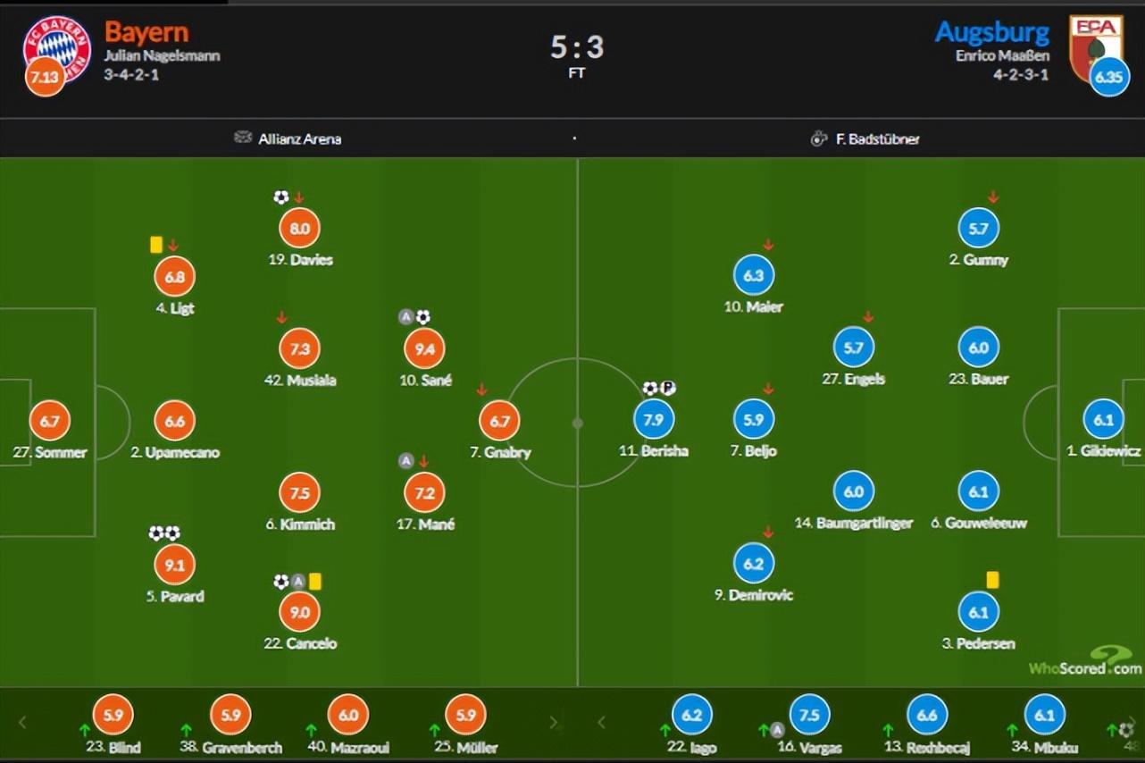 此後,雙方均無法再次改寫比分,最終拜仁5-3擊敗奧格斯堡。