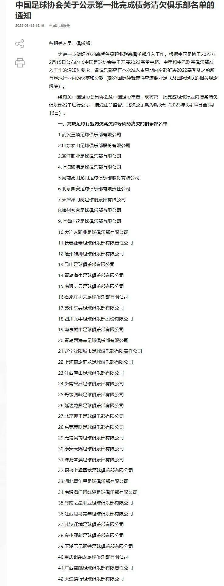 值得注意的是,此次債務清欠,中國足協給出的說明是:根據亞足聯准入規程和中國足協准入規程的相關要求,俱樂部可通過實際付款、與債權人協商一致簽署相關協議等方式延期解決債務。其中與債權人簽署的相關協議須在中國足協備案,中國足協將依據相關協議持續關注後續落實情況。