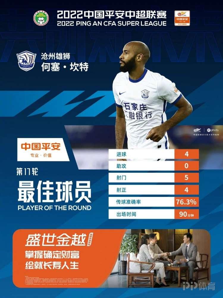 中超官方寫道:在2022中國平安中超聯賽第17輪最佳球員評選中,滄州雄獅隊外援何塞-坎特大四喜的驚喜表現,不僅助力球隊逆轉贏得勝利,獲得寶貴3分更是幫助隊伍排名上升。