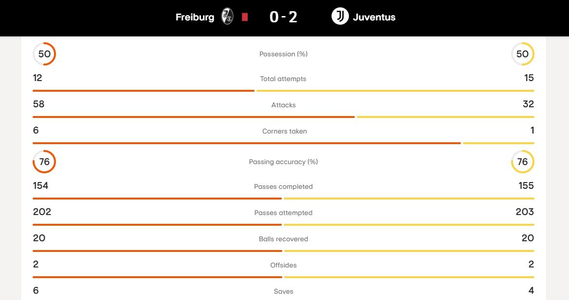 此後,雙方均無法再次改寫比分,最終尤文2-0擊敗弗賴堡。