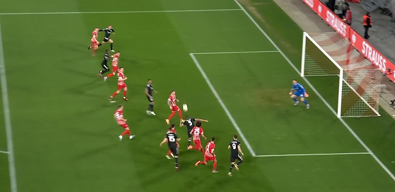 第27分鐘,布雷默近距離頭球攻門擊中橫樑後彈出,弗拉霍維奇補射破門,但VAR確認其越位在先,進球被判無效。