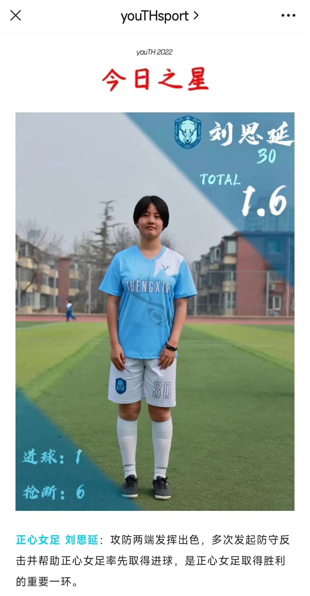 當場比賽的MVP是正心的劉思延,她在常規比賽時間和點球大戰中都有進球入賬,賽事“官方”媒體平臺youTHsport賽後這樣評價劉思延:“攻防兩端發揮出色,多次發起防守反擊,並幫助正心女足率先取得進球,是正心女足取得勝利的重要一環。”文中配上了劉思延身着隊服的照片,並且標註了她本場的數據:進球1、搶斷6。2月27日比賽當天發表的這篇文章,閱讀數量已有六百多次。