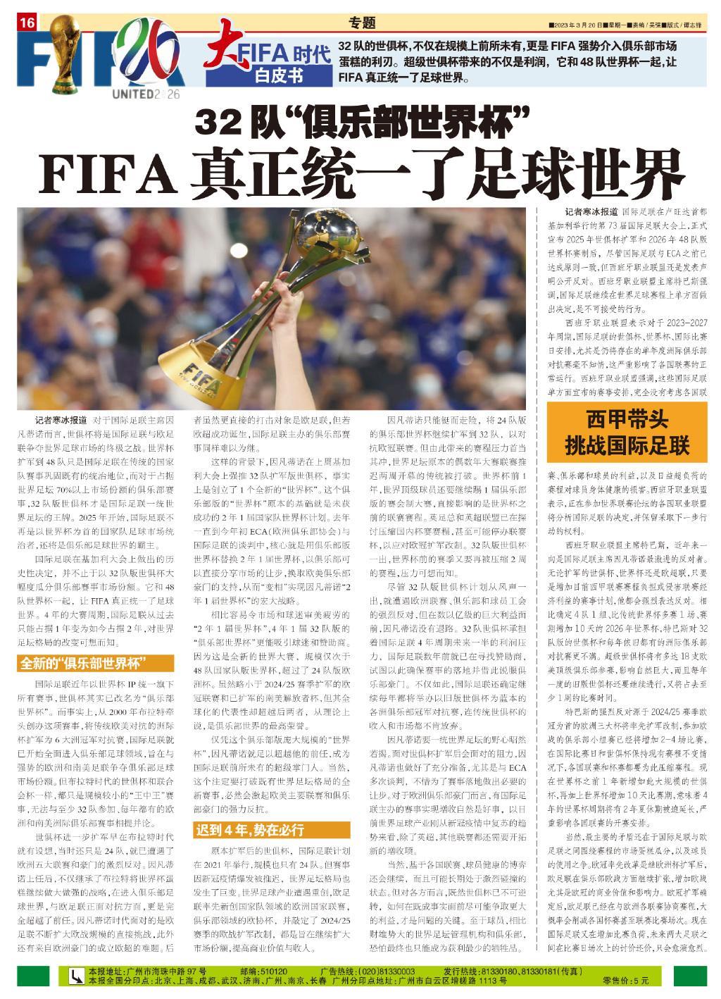 記者寒冰報道 32隊的世俱杯,不僅在規模上前所未有,更是FIFA強勢介入俱樂部市場蛋糕的利刃。超級世俱杯帶來的不僅是利潤,它和48隊世界盃一起,讓FIFA真正統一了足球世界。