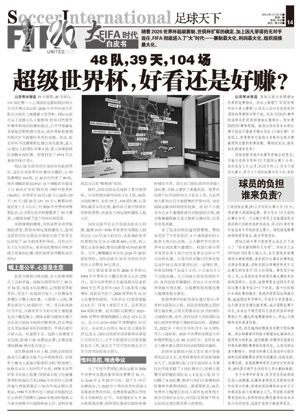 記者寒冰報道 隨着2026世界盃超級賽制、世俱杯擴軍的確定,加上因凡蒂諾的無對手連任,FIFA徹底進入了“大”時代——賽制最大化、利潤最大化、組織規模最大化。