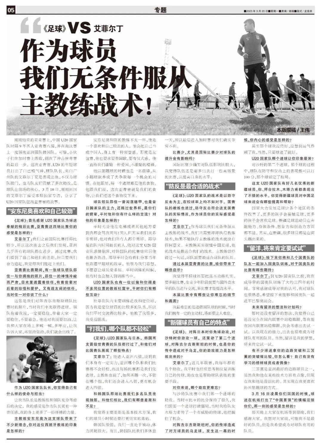 艾菲爾丁:到U20國青隊之前,我在成導帶的國奧隊訓練了大約三四年的時間。非常感謝成導對我的認可,我對球隊也很熟悉,希望接下來能夠和國奧隊一起進軍巴黎奧運會。